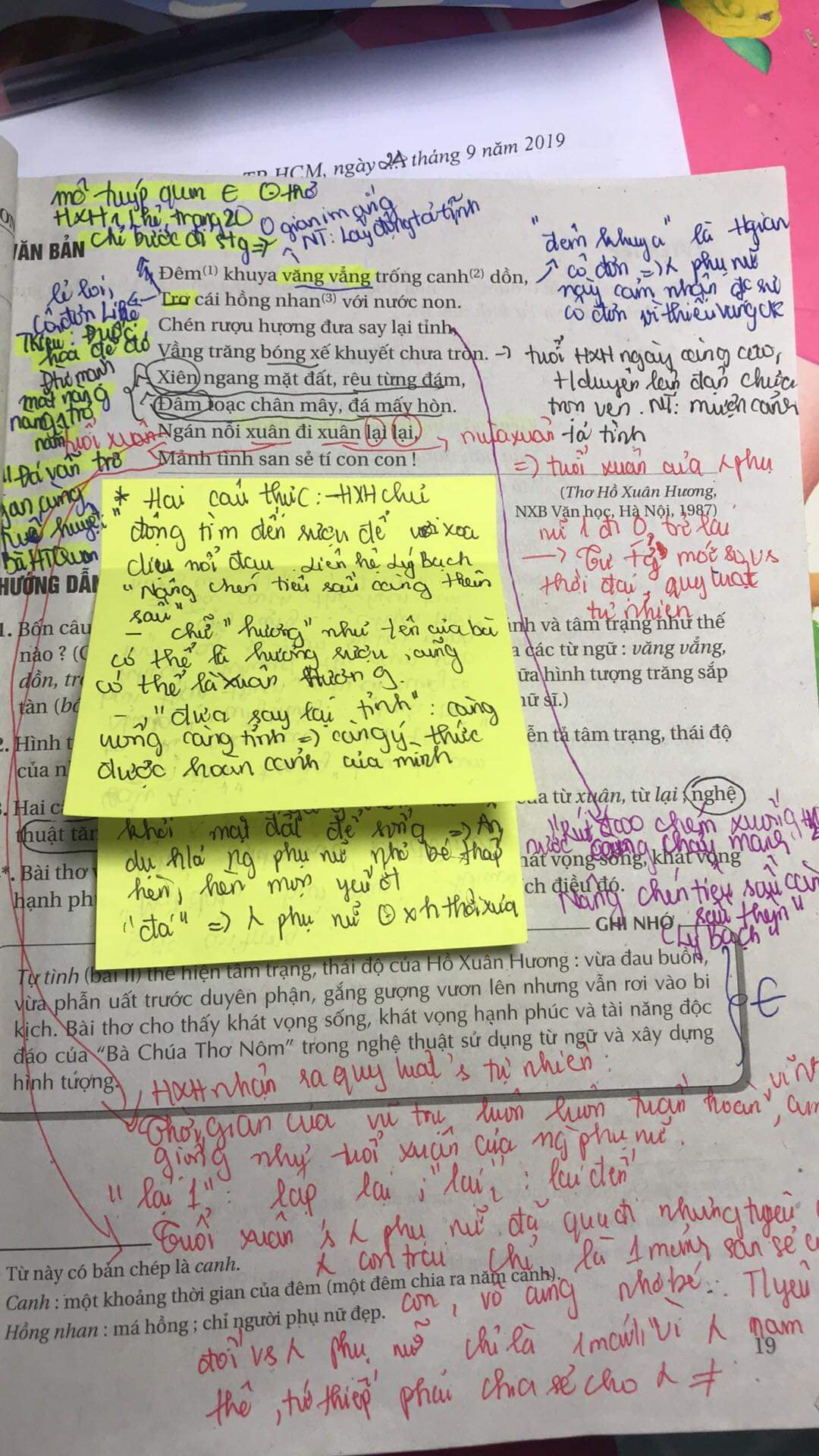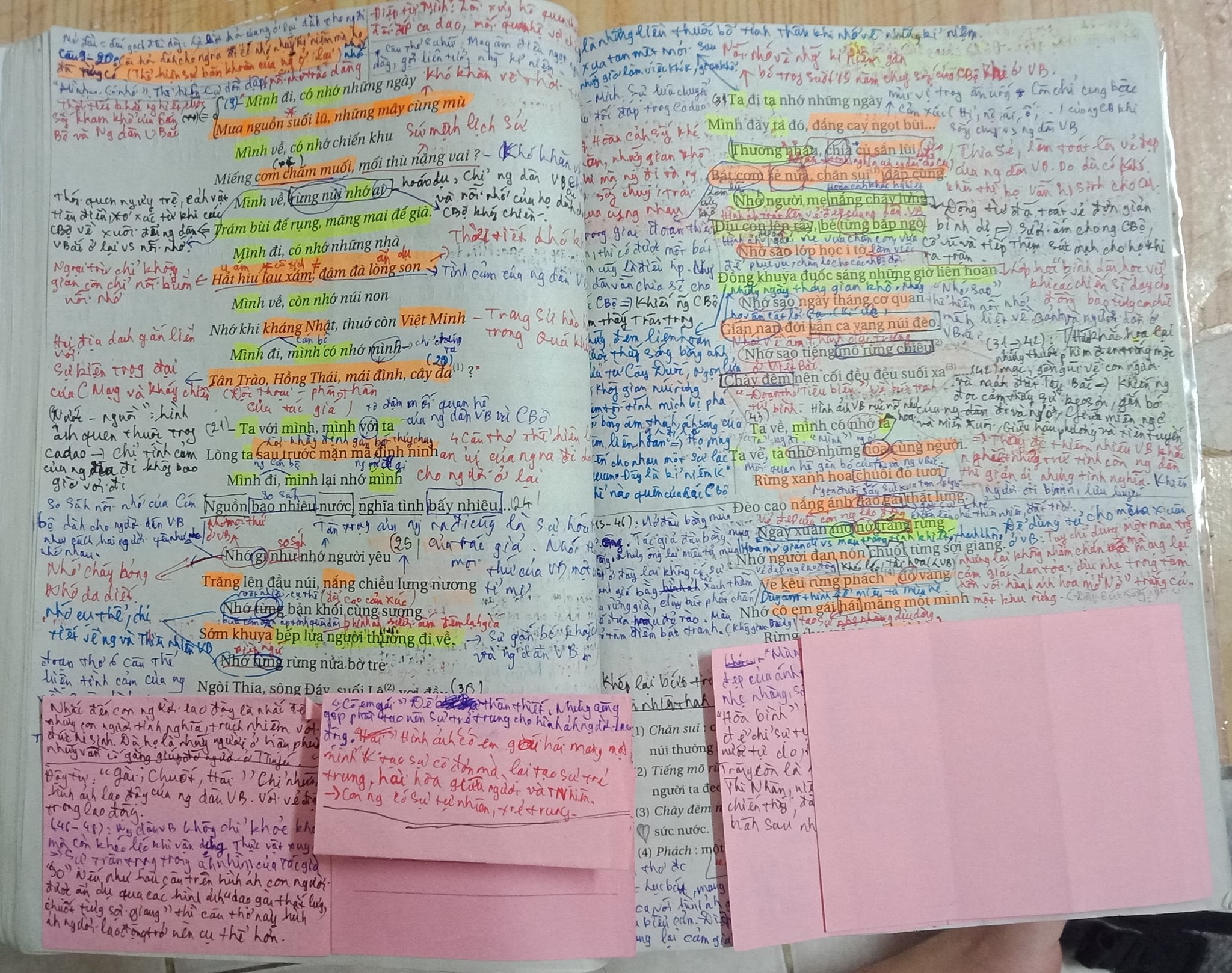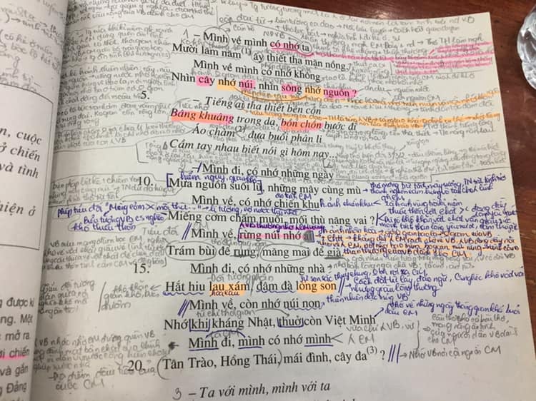 Trong hình ảnh cho thấy, nữ sinh ghi chú lại ý nghĩa của từng câu chữ, thậm chí là từng từ trong bài thơ “Việt Bắc” trong sách giáo khoa. Không những vậy, điểm sơ qua, trang sách này cũng có vài màu mực, hết ghi chú bằng bút chì, cô nàng chuyển sang bút bi rồi “note” lại bằng cả bút màu.