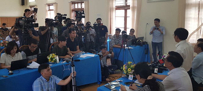 Phóng viên báo chí tham dự cuộc cung cấp thông tin ở Sở GD-ĐT Sơn La. Ảnh: Thanh niên.