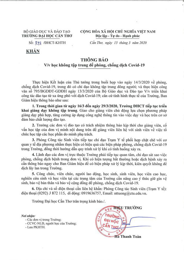 Sáng ngày 15/3, trường ĐH Cần Thơ đã có công văn khẩn số 521/ĐHCT-KHTN về việc tiếp tục cho sinh viên nghỉ học đến hết ngày 29/3.