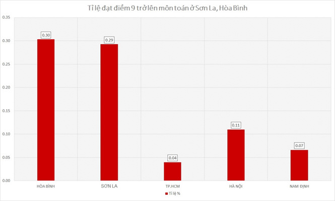 Tỉ lệ thí sinh đạt điểm 9 trở lên môn toán tại Hòa Bình cao hơn hẳn so với các địa phương khác. Biểu đồ Lê Hiệp.