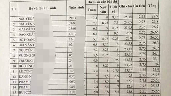 Bảng điểm có đủ họ tên, ngày tháng năm sinh và số điểm 3 môn (Toán, Ngữ văn, Lịch sử) của các thí sinh. Đáng chú ý, số lượng điểm trên 8 và 9 môn Văn và Sử cao bất thường. Ở môn Ngữ Văn, 5 trong số 35 thí sinh trong danh sách đạt điểm 9. Tổng điểm 3 môn và điểm ưu tiên của 35 thí sinh trong bảng đều trên 24. Trong đó, thí sinh N.V.D có điểm cao nhất là 27,9 (Toán 7,4; Văn 9; Sử 8,75; và 2,75 điểm ưu tiên). Thí sinh đứng thứ hai cũng được 26,8 điểm.