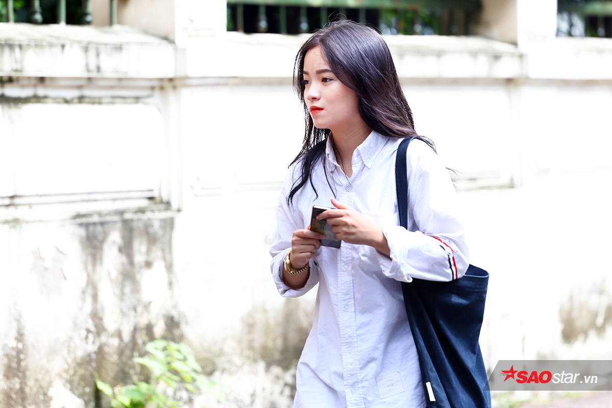 Một nữ thí sinh có làn da trắng sứ nổi bật bước vào phòng thi.