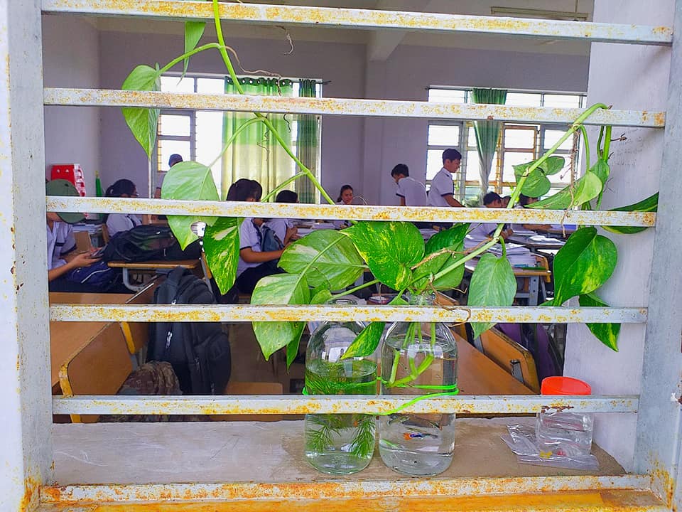 Bạn Đức Anh chia sẻ: “Thay vì trang trí giấy màu thì trồng cây, nuôi cá như thế này không gian bắt mắt và sinh động hơn. Thế này thì còn ai chán học nữa?”