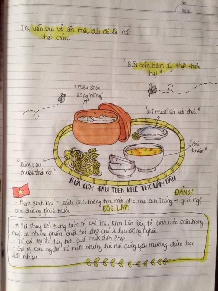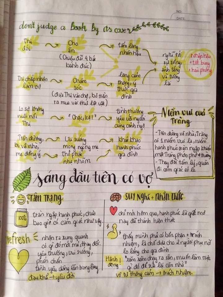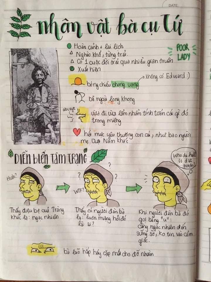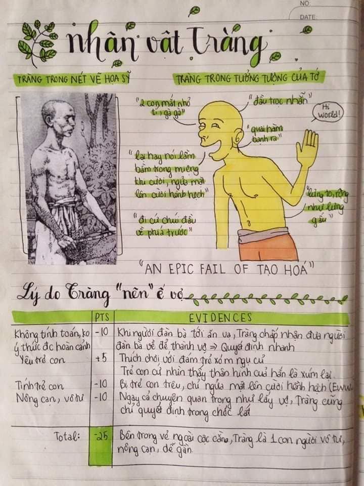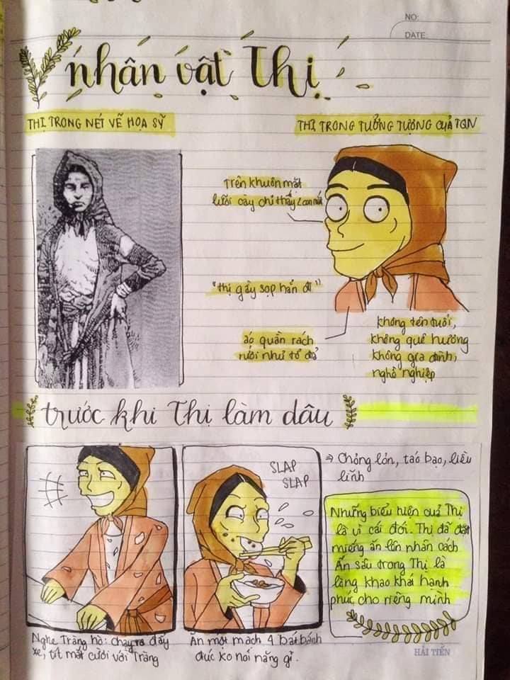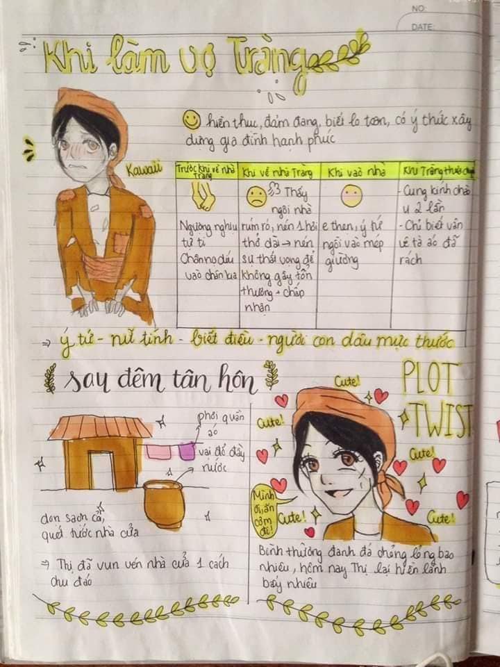 Nếu bạn đang trong tình trạng trên thì hãy học ngay cách của hội học trò dưới đây để yêu thích môn văn hơn. Từ tác phẩm “Vợ Nhặt” dài dằng dặc, khó hiểu và cũng khó phân tích, tụi học trò đã cụ thể hóa bằng một sơ đồ tư duy tự tay vẽ. Ví dụ như nhân vật Tràng, các học sinh này vẽ theo cách tả của nhà văn với bề ngoài hơi xấu xí và ngờ nghệch. Hoặc nhân vật Thị thì luộm thuộm nhếch nhác cho đến hình ảnh nồi chè khoán hay hình ảnh bà cụ Tứ…Tất cả đều được cụ thể hóa bằng hình ảnh vô cùng sống động và dễ nhớ.