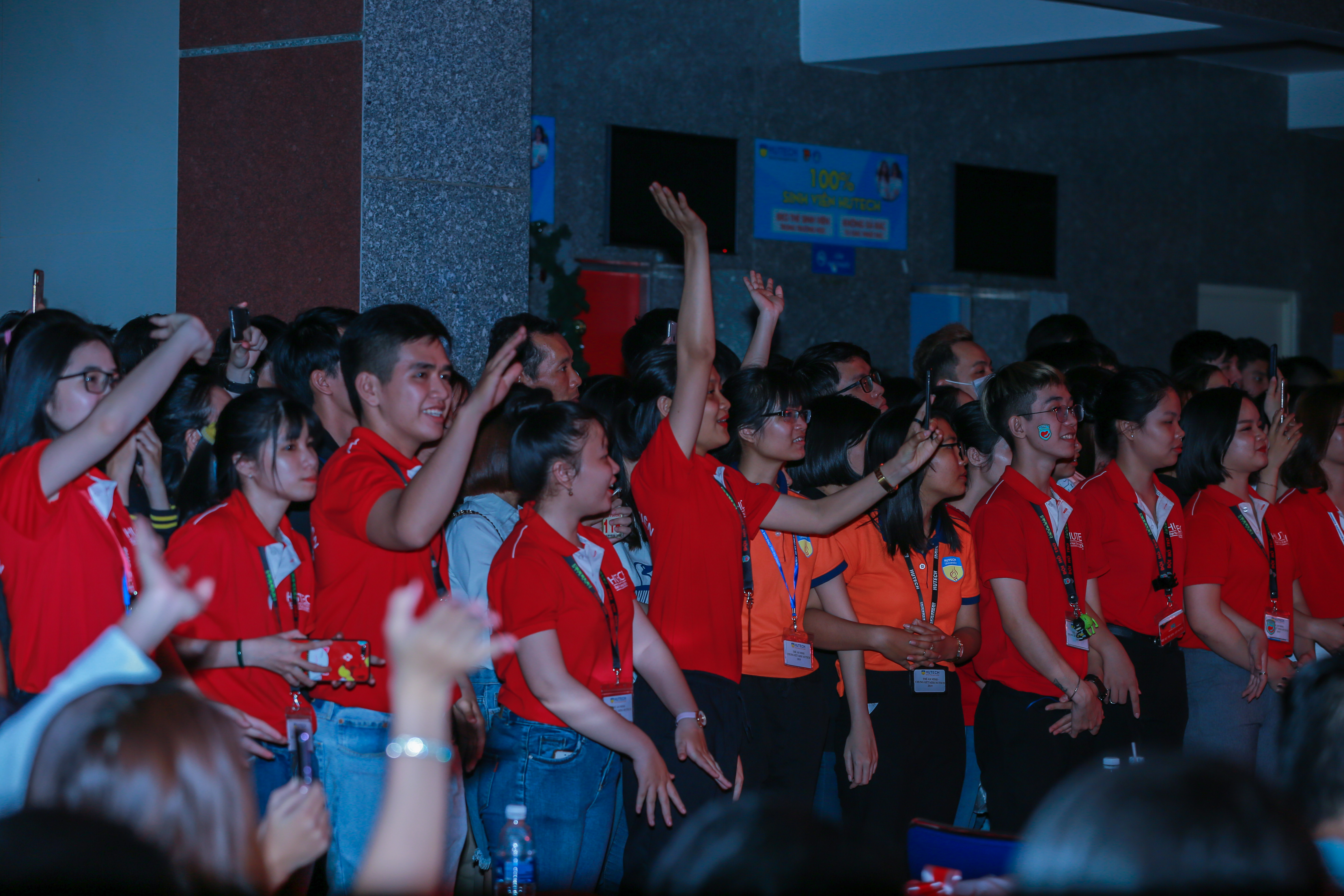 Các cổ động viên giơ cao cánh tay theo điệu nhạc trên sân khấu.