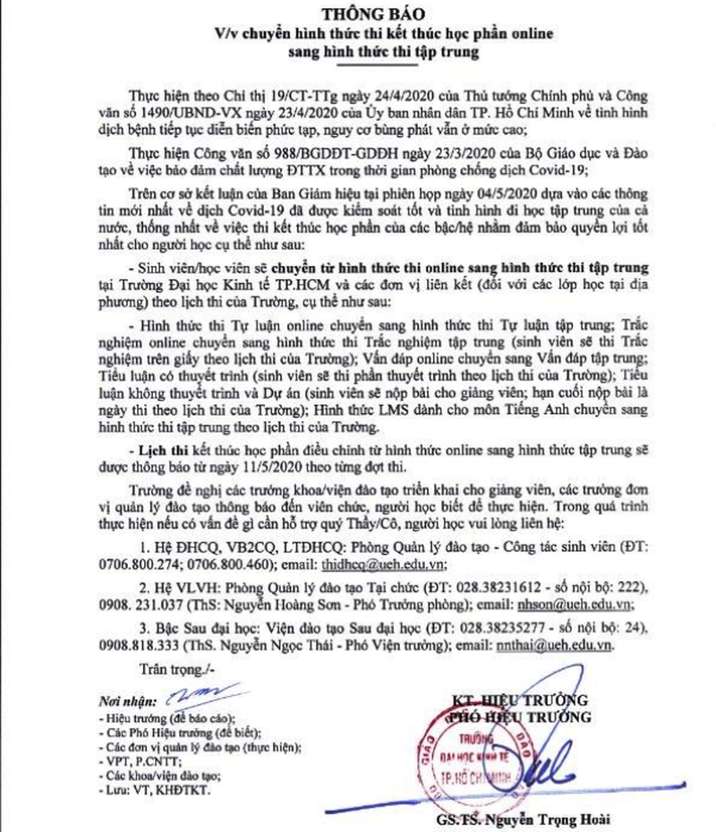 Mới đây, Trường ĐH Kinh tế TP.HCM (UEH) vừa bất ngờ ra thông báo chuyển hình thức thi kết thúc học phần online sang hình thức tập trung khiến nhiều sinh viên bức xúc vì…không kịp trở tay.