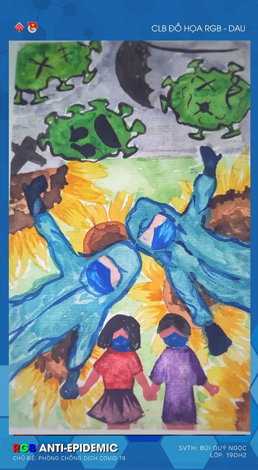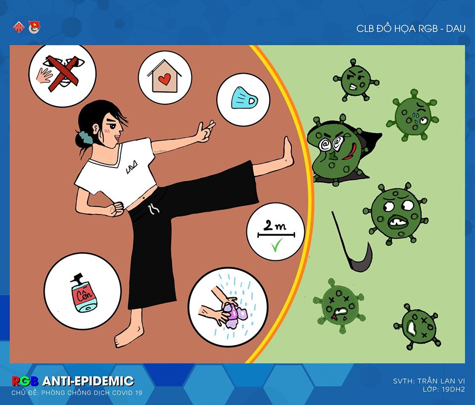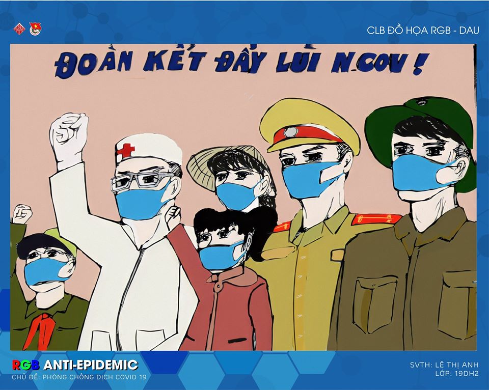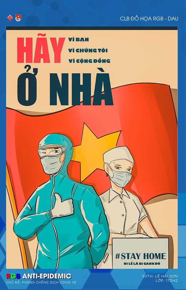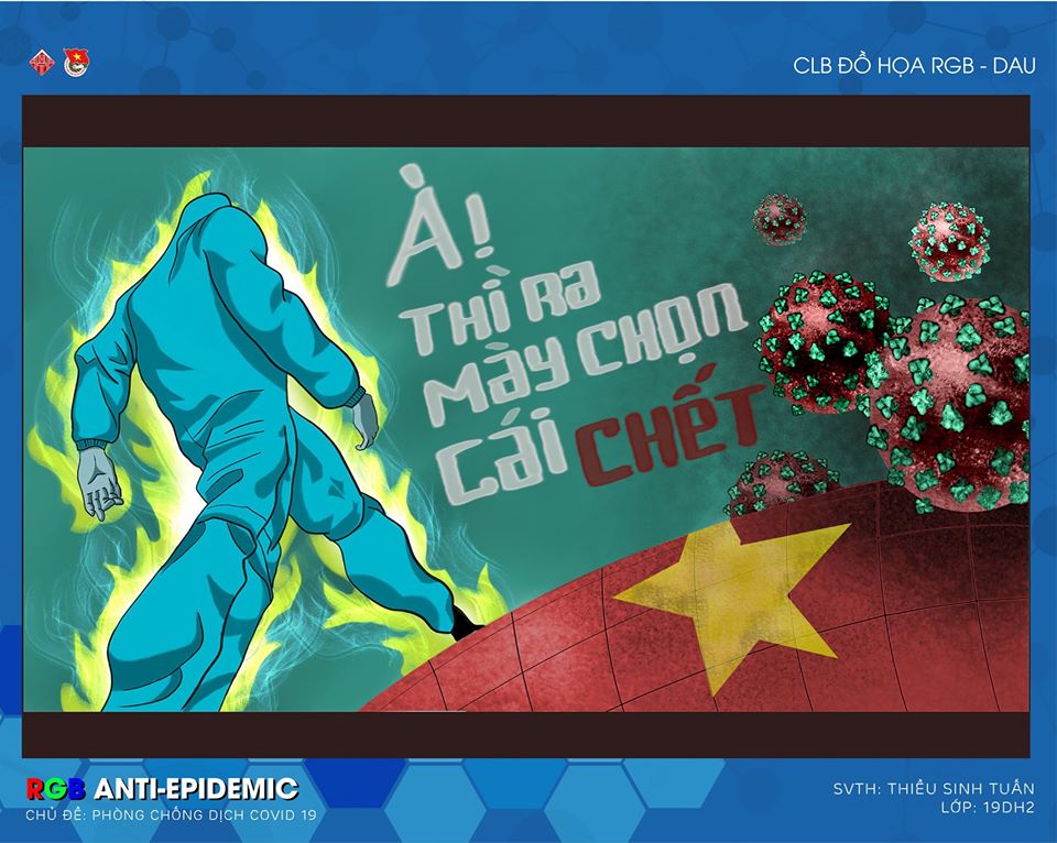Với mong muốn góp chút sức mình trong cuộc chiến mà mỗi cá nhân đều là chiến sĩ trên mặt trận chống dịch, các bạn sinh viên CLB Đồ họa RGB Trường Đại học Kiến trúc Đà Nẵng đã cùng nhau thực hiện các tác phẩm, poster tuyên truyền góp phần nâng cao ý thức người dân về việc cách ly, giãn cách xã hội, cũng như bày tỏ sự biết ơn với những người đang xông pha chống dịch nơi tuyến đầu. Mỗi hình ảnh là một thông điệp!