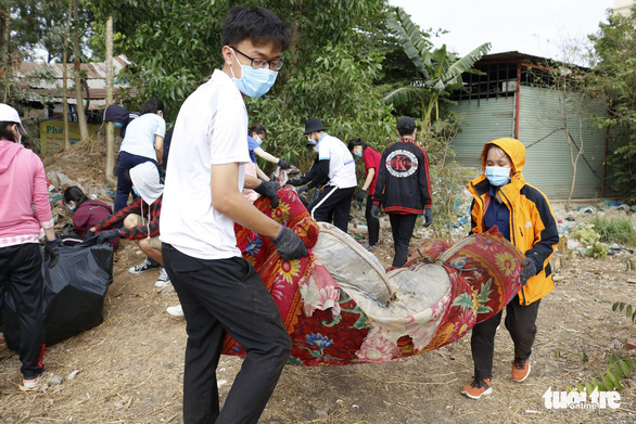 Mặc dù rác thải và bụi bặm rất nhiều nhưng các bạn sinh viên vẫn hăng say dọn dẹp