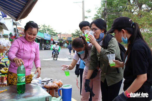 Nhìn thấy sinh viện dọn rác giữa trời nắng nóng nên chị Thúy Liễu (45 tuổi, người bán tạp hóa bên đường) đã hỗ trợ miễn phí nước uống cho các bạn