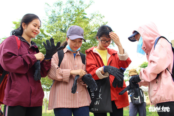 Các sinh viên được hỗ trợ bao tay trước khi nhặt rác để đảm bảo an toàn