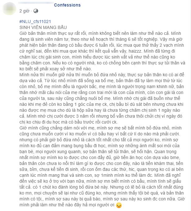 Mới đây, trên một diễn đàn dành riêng cho các bạn sinh viên, một nữ sinh vừa tâm sự câu chuyện của chính mình khi “trót dại” để dính bầu khi đang là sinh viên năm cuối. Theo đó, cô bạn đang hết sức đau đầu khi không biết nên xử lý như thế nào với cái thai trong bụng. Bởi nếu giữ lại đứa bé, cô không đủ điều kiện để nuôi dưỡng, lại đang còn trong thời gian đi học thì tương lai sẽ dang dở nhưng bỏ đứa bé cô cũng không đành lòng. Ngoài ra, cô cũng không dám tâm sự cho mẹ của mình biết, bởi mẹ cô có tư tưởng '”trọng nam khinh nữ”, con gái chưa có chồng mà “có chửa” sẽ bị mắng nhiếc, chửi rủa.