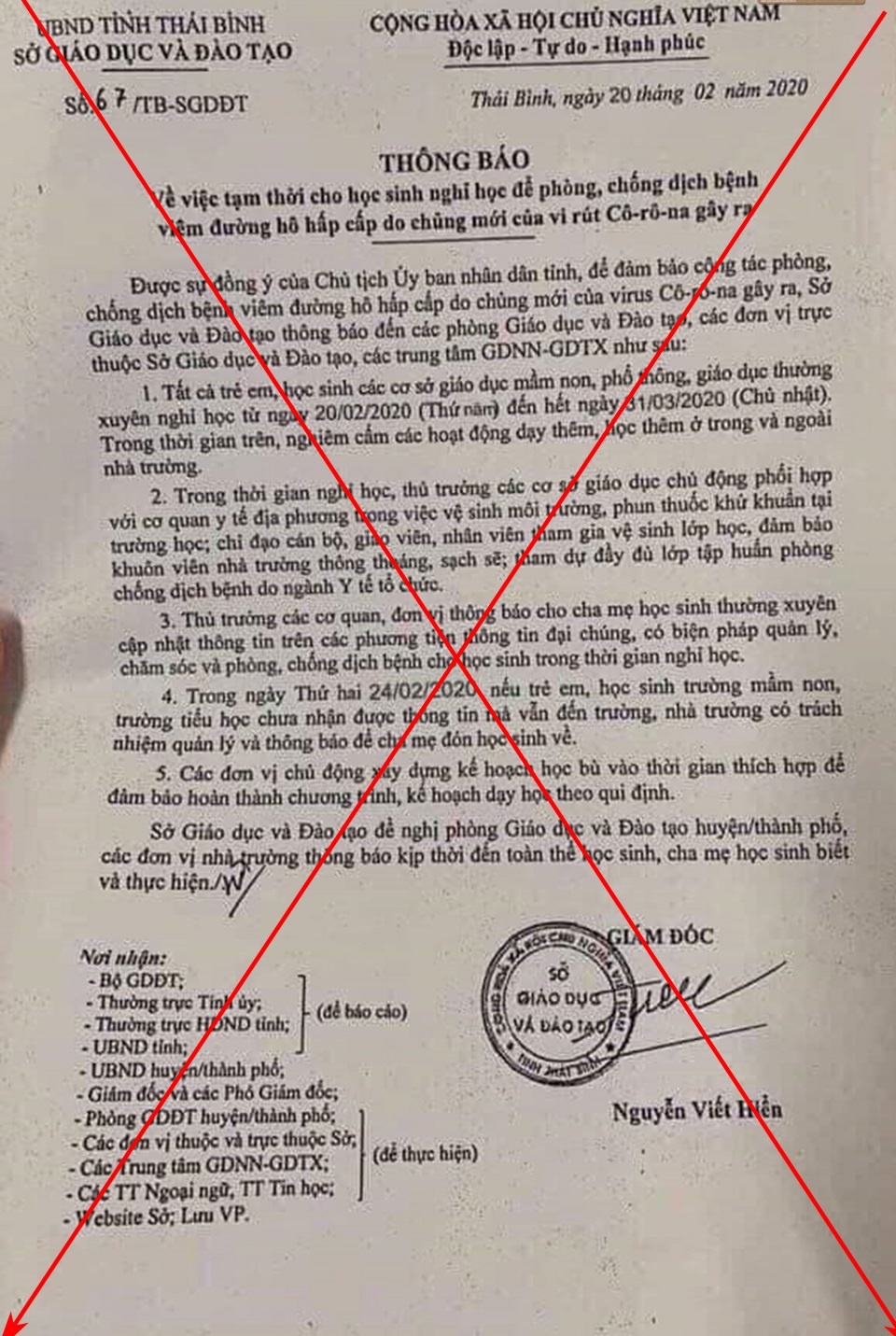 Chiều 20/2, Giám đốc Sở Giáo dục và Đào tạo (GD-ĐT) tỉnh Thái Bình - ông Nguyễn Viết Hiển cho biết, văn bản đang lan truyền trên mạng xã hội về thông báo của Sở cho học sinh tạm thời nghỉ học đến ngày 31/3 để phòng, chống dịch Covid - 19 là giả mạo.
