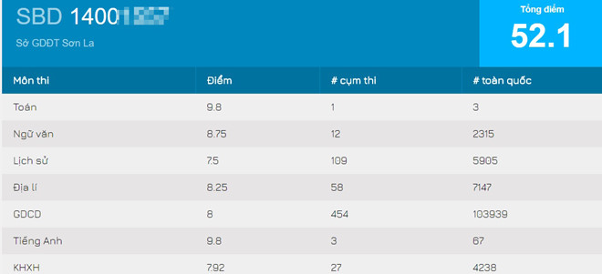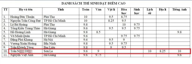Trước đó, điểm thi thử từ tháng 3 của hai thí sinh Sơn La lan truyền trên mạng. Giáo viên chủ nhiệm của em B.N. xác nhận bảng điểm này là đúng.