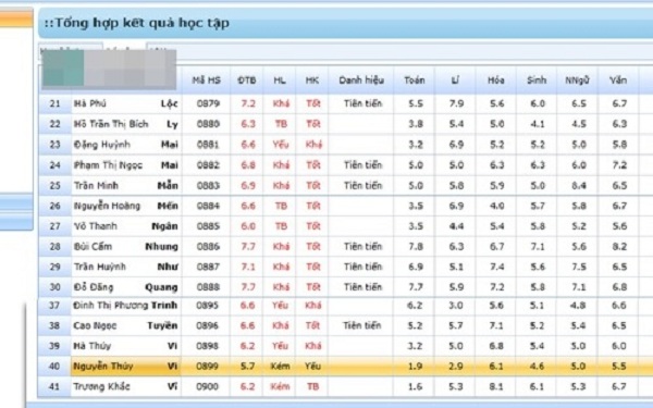 Bảng kết quả cho thấy Thúy Vi có kết quả học khá kém, môn Toán được 1.9, môn Lý được 2.9 và môn Sinh được 4.6.