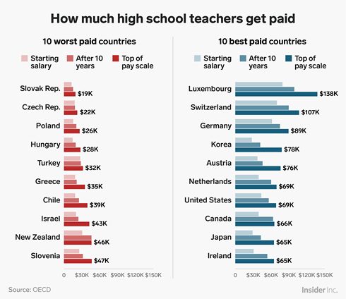 Luxembourg và Thụy Sĩ tiếp tục thống trị trong danh sách các quốc gia trả lương tốt nhất cho giáo viên trung học với mức cao nhất lần lượt là 138.000 USD (khoảng 3,1 tỷ đồng) và 107.000 USD/năm (khoảng 2,4 tỷ đồng). Tiếp theo là Đức với mức lương là 89.000 USD (khoảng 2 tỷ đồng), Hàn Quốc đứng thứ 4 với mức lương là 78.000 (khoảng 1,8 tỷ đồng).
