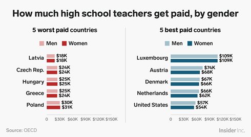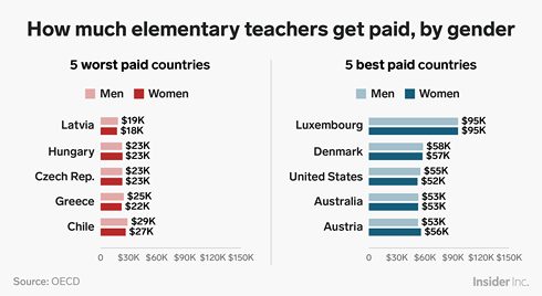 Giáo viên tiểu học ở Luxembourg cả nam và nữ đều được nhận mức lương tương đương nhau, trung bình 95.000 USD/năm (~ 2,2 tỷ đồng). Australia cũng làm được điều tương tự, 53.000 USD (~ 1,2 tỷ đồng) cho cả 2 giới. Một số quốc gia trả lương cao như Đan Mạch, Mỹ, Áo, con số chênh lệch giữa hai giới là không cao. Đáng chú ý, ở Áo, nữ giới được trả lương cao hơn nam giới.