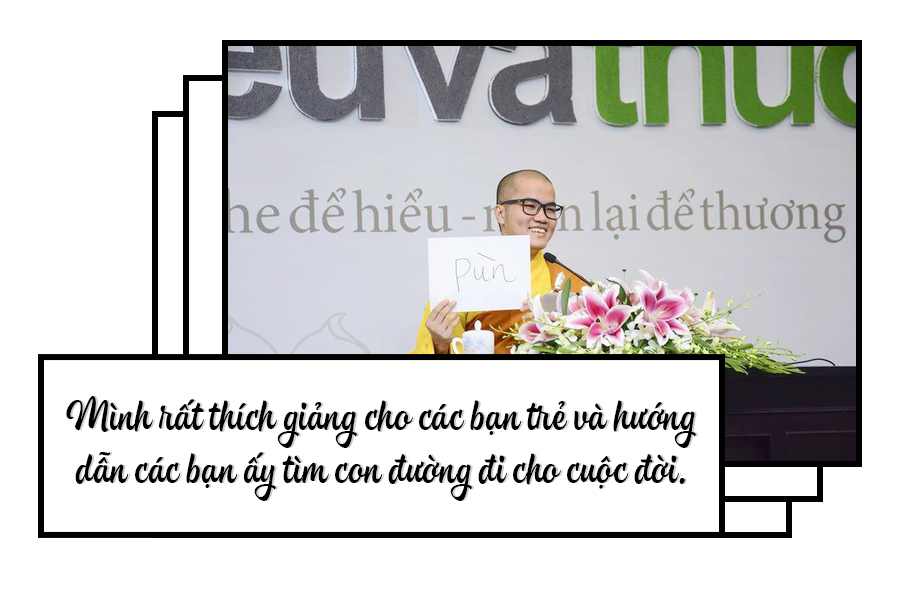 Khi giảng mình cố gắng tạo tiếng cười cho các bạn ấy. Muốn các bạn trẻ đến chùa thì mình phải tạo môi trường cho các bạn ấy thích, chứ các bạn ấy cũng dễ chán lắm. Mình cũng hay sử dụng và “cập nhật” ngôn ngữ của người trẻ để truyền đạt Phật pháp vào đó cho các bạn. Ví dụ một bài giảng 60 phút mà mình truyền đạt được một vài điều căn bản từ lời Phật dạy và các bạn ấy nhớ để thực tập trong đời sống thì cũng xem như đã là thành công.