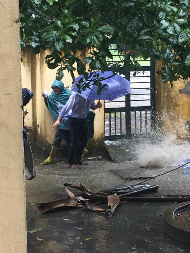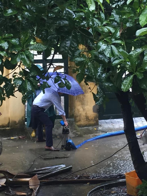Thầy hiệu trưởng (áo trắng) dầm mưa giúp các bạn học sinh sửa ống thoát nước để sân trường bớt ngập nước.