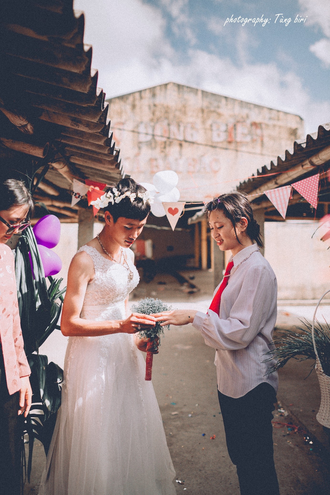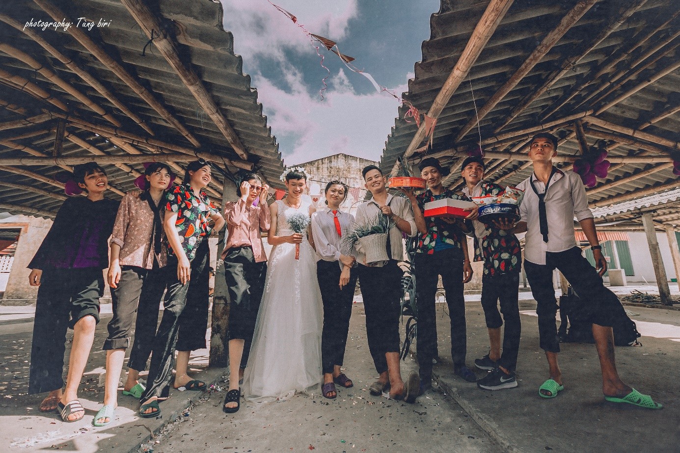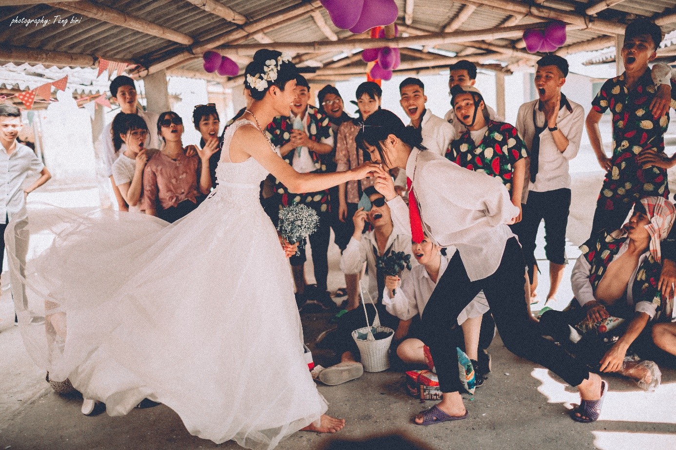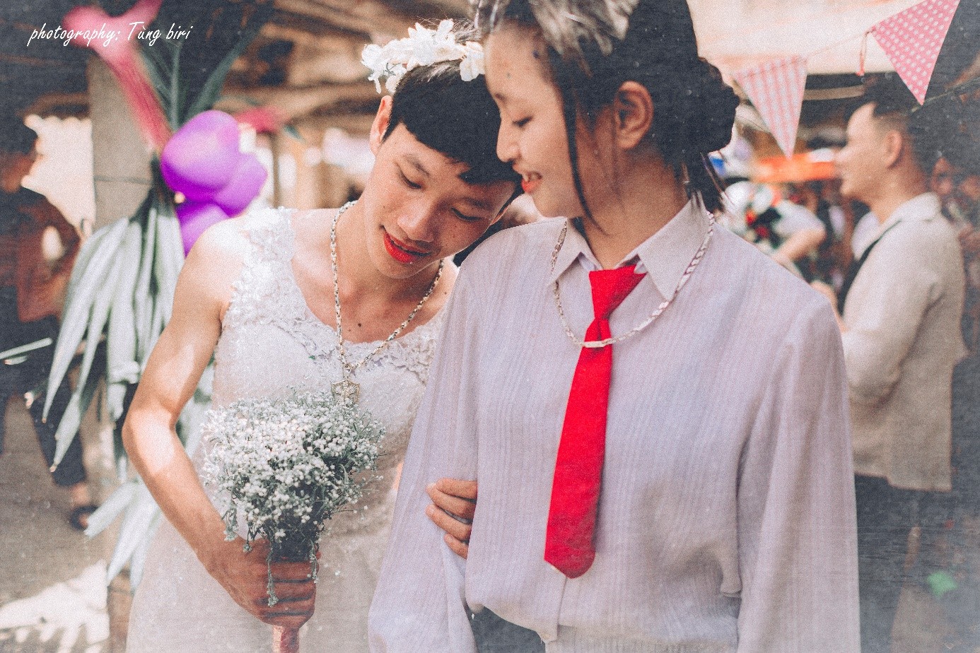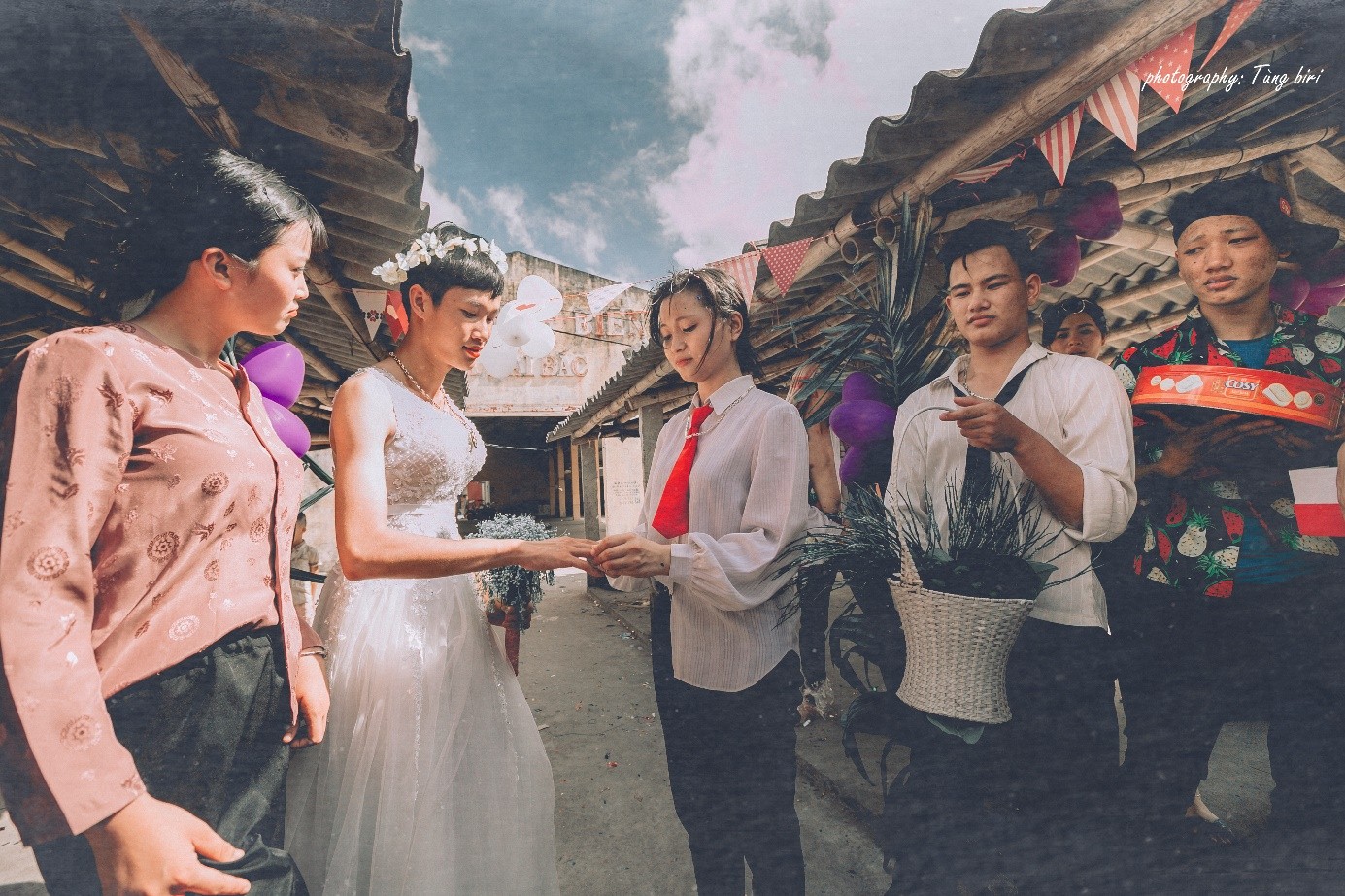 Bộ ảnh này còn cực độc thì “cô dâu”, “chú rể” còn hoán đổi giới tính cho nhau khi cô dâu là nam, còn chú rể lại là nữ. Đồng thời tập thể lớp trở thành quan viên hai họ chứng kiến cho ngày vui của “cặp đôi” đã nhận được nhiều lượt yêu thích của dân mạng.