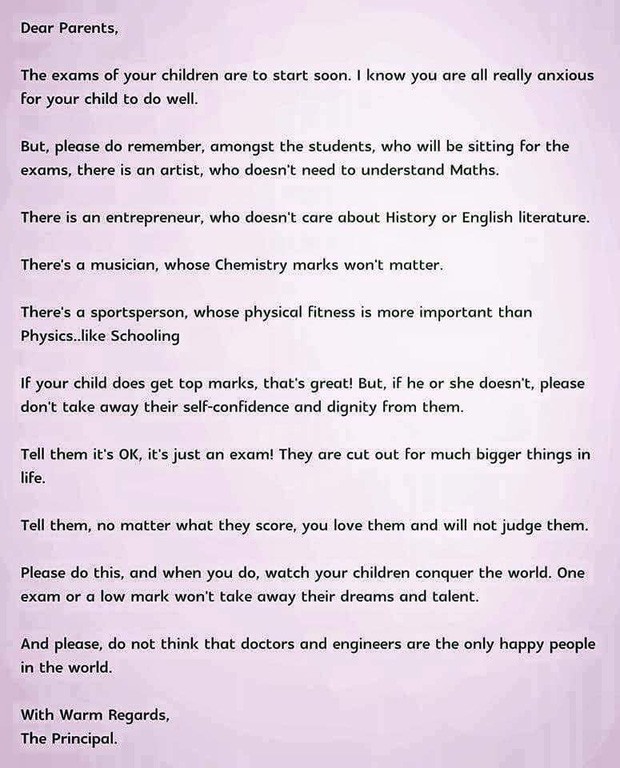 Trong bức thư, vị hiệu trưởng không quên nhắn nhủ các bậc cha mẹ đừng quá coi trọng điểm số, đừng làm mất đi sự tự tin và nhân phẩm của con. Thành công trong tương lai của con họ không phụ thuộc hoàn toàn vào điểm số.