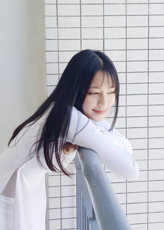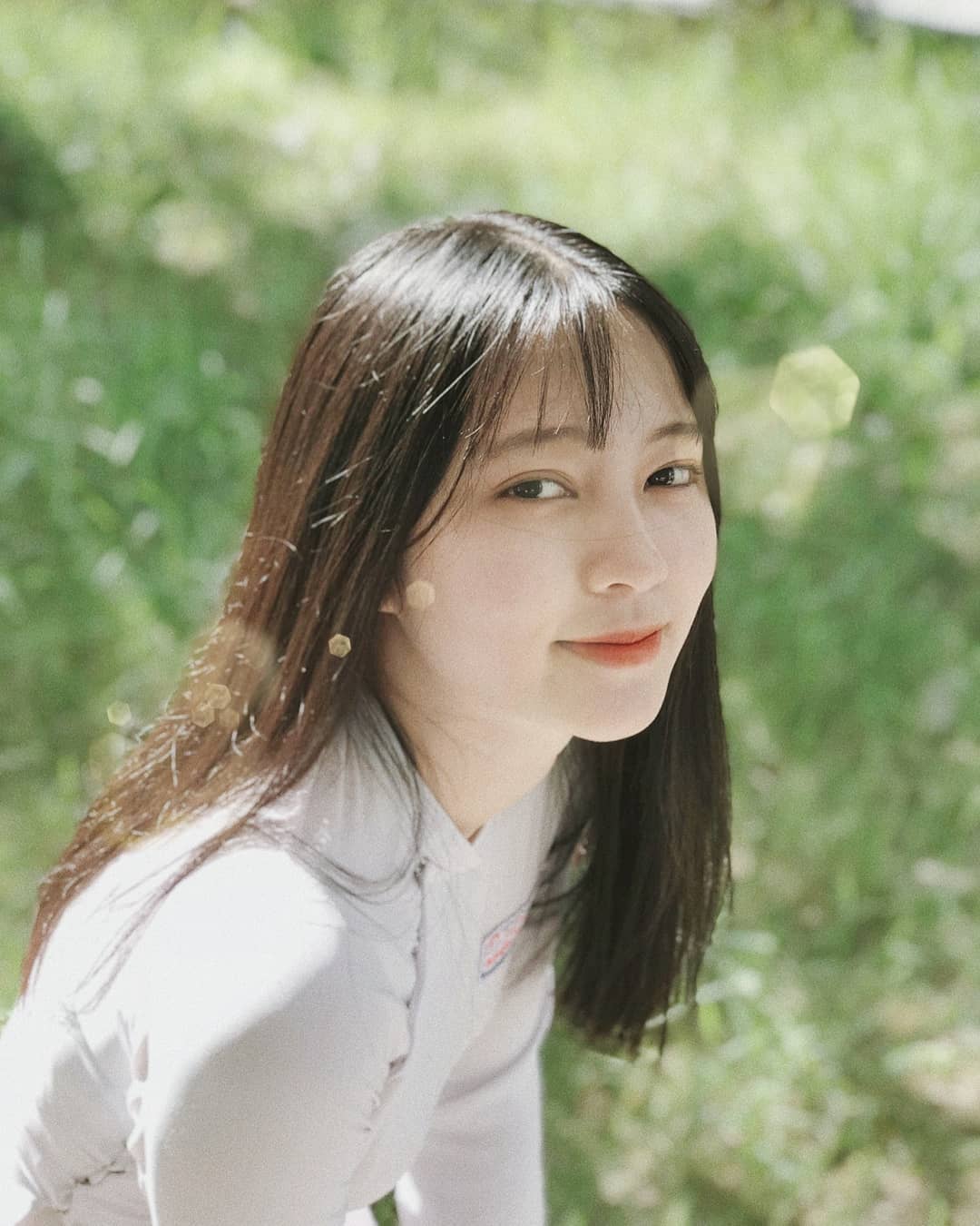 Hình ảnh Phạm Lê Khánh linh diện áo dài trắng tinh khôi, nở nụ cười chúm chím trong ánh nắng.