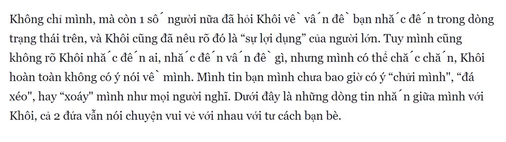 Bên cạnh đó, Lan Thy cũng giải bày về những tai tiếng khác như gian lận trong kì thi HSG,… Quan trọng nhất, Phạm Tường Lan Thy khẳng định mình hoàn toàn không ăn cắp ý tưởng của người bạn đã cùng mình thực hiện dự án cho vòng thi nghiên cứu khoa học cấp trường, kèm theo đó là những đoạn đối thoại chứng minh dòng trạng thái ẩn ý “Cái khoảng khắc mà mọi thành quả công lao của bạn bị người khác copy và đem bán” của Gia Khôi đăng tải trước khi qua đời hoàn toàn không phải đề cập về Lan Thy như nhiều người đồn đoán.