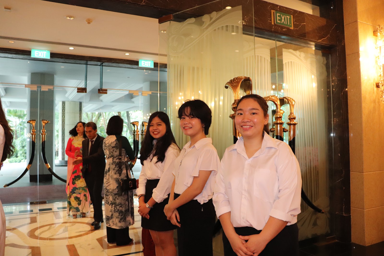 Trong sự kiện này, các bạn trẻ đóng vai trò lớn trong đội ngũ tiếp tân và chỉ dẫn khách tham gia. Dù phải tới chuẩn bị từ sớm, thế nhưng trên môi các bạn vẫn luôn nở nụ cười tươi tắn để chào đón quan khách tham dự.