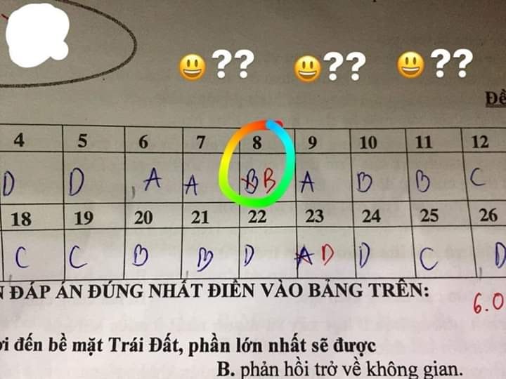 Có bạn lại nghi ngờ đây là một phần dàn dựng. Bạn học sinh trong lúc làm bài kiểm tra có thể quên mất không điền đáp án câu đó nên giáo viên điền thêm vào bổ sung để nhắc nhở. Khi nhận bài chắc vì quá cay cú nên viết chữ B màu xanh sang phía bên cạnh.