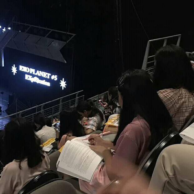 Theo đó, trên Twitter, một người hâm mộ đã chia sẻ bức ảnh chụp được tại concert của EXO kèm theo dòng trạng thái: “Cô bé này cũng còn trẻ lắm. Hình như đang cố làm nốt chỗ bài tập trước khi concert bắt đầu”.