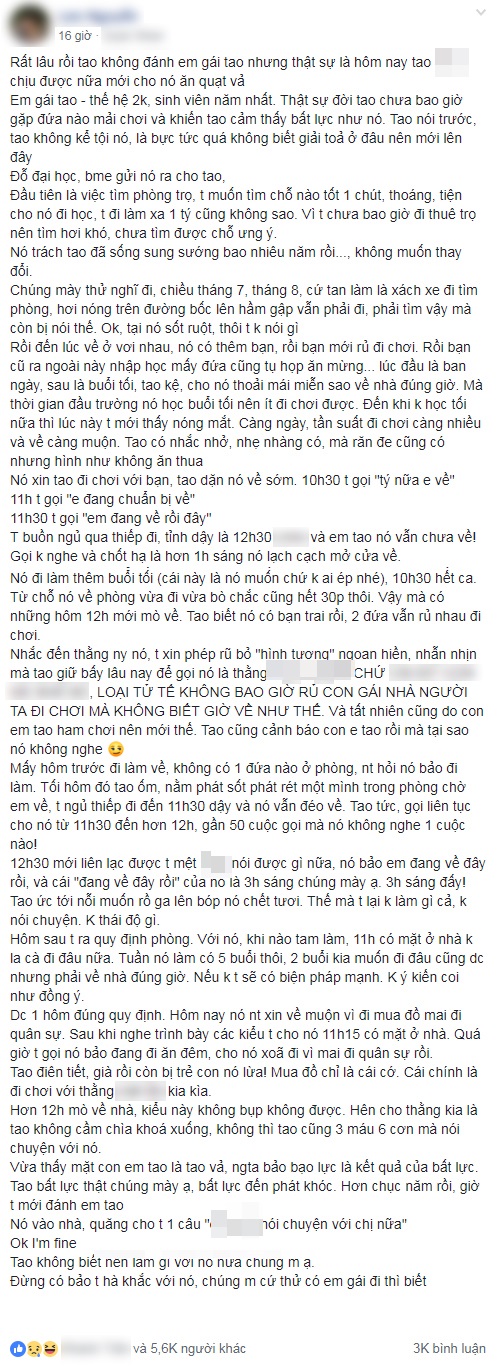 “Rất lâu rồi tớ không đánh em gái tớ nhưng thật sự là hôm nay không chịu được nữa mới cho nó ăn quạt vả. Em gái mình - thế hệ 2k, sinh viên năm nhất. Thật sự đời tớ chưa bao giờ gặp đứa nào mải chơi và khiến mình cảm thấy bất lực như nó. Tớ nói trước, tớ không kể tội nó, là bực tức quá không biết giải toả ở đâu nên mới lên đây.