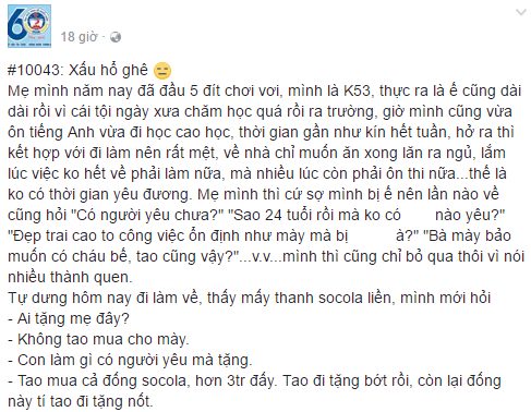 Lời tâm sự của chàng trai về việc mẹ chi hơn 3 triệu đồng mua socola thay mặt anh đi tặng từng bạn gái mà anh quen biết khiến nhiều người vô cùng thích thú. Nguồn: NEU.