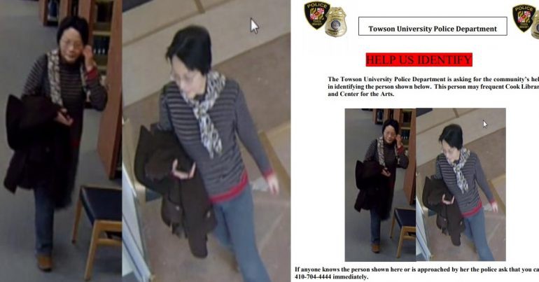 Ngoài ra, cô đi giày nâu, đeo khăn lụa nhiều màu và cầm theo chiếc áo khoác đen. Nếu ai nhìn thấy người phụ nữ này, vui lòng liên hệ với các cảnh sát ngay lập tức (đối tượng sẽ không bị truy tố về mặt hình sự, chỉ bị cảnh cáo mà thôi!)” - cảnh sát trường đại học Towson viết qua một thông báo hàng loạt trên thư điện tử.