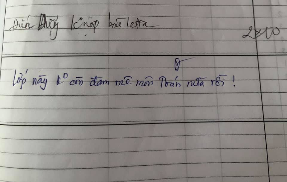 Mới đây, do quá “bất lực” khi chứng kiến các học trò của mình không còn hứng thú môn Toán, một thầy giáo đã viết hẳn vào sổ đầu bài lời nhắn: “Lớp này không còn đam mê với môn Toán nữa rồi” khiến ai đọc được cũng vừa thương vừa buồn cười.