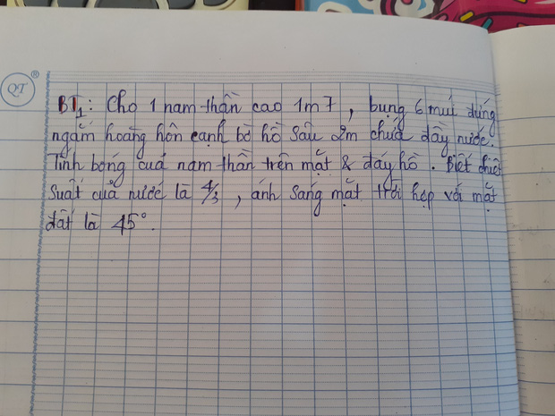 Cụ thể, mới đây trong một group học tập, các bạn học sinh đang rần rần truyền tay nhau đề bài môn Vật lý chất hơn nước cất. Theo đó, đề bài như sau: “Cho một nam thần cao 1m7, bụng 6 múi đứng ngắm hoàng hôn cạnh bờ hồ sâu 2m chứa đầy nước. Tính bóng của nam thần trên mặt và đáy hồ. Biết chiết suất của nước là 4/3, ánh sáng mặt trời hợp với mặt đất là 45 độ.”