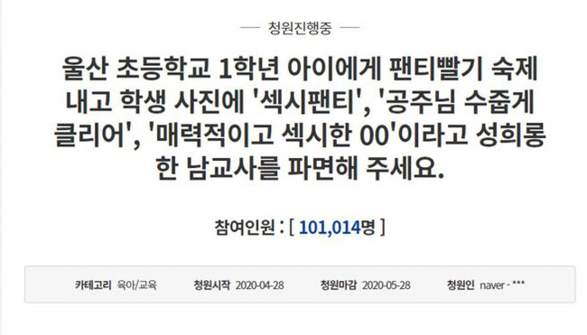 Theo đó ngày 27/4 vừa qua, một lá đơn kiến nghị đã được gửi lên trang web của Nhà Xanh kể về một thầy giáo của trường tiểu học ở thành phố Ulsan (gọi là A) khiến dân mạng vô cùng phẫn nộ. Trong đó, thầy A giao bài tập về nhà không phù hợp rồi có những bình luận khiếm nhã dành cho học sinh của mình.