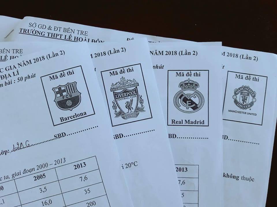 Cụ thể, thay vì mã đề thi được đánh dấu bằng những con số nhưng thường lệ, thì thầy giáo ra đề đã dùng tên các CLB bóng đá hàng đầu thế giới để làm mã đề thi.