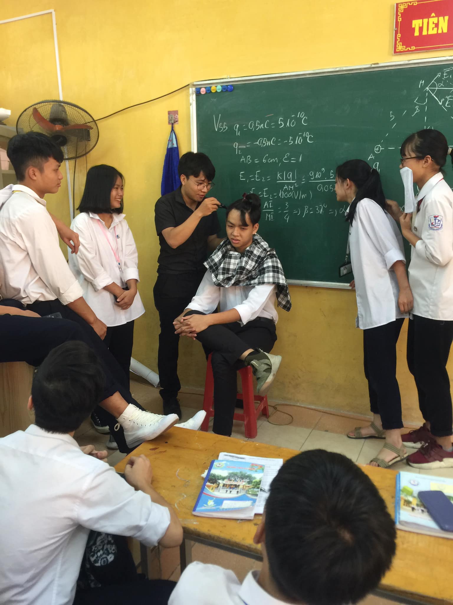 Thầy giáo trẻ tự tay cắt tóc cho nam sinh để phù hợp hơn với lớp học. Ảnh: Đỗ Mạnh Hùng/Trường Người Ta