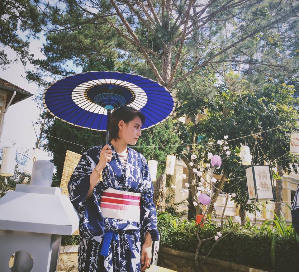 Thảo Nguyên trong trang phục Kimono chụp tại Ngày hội văn hóa Việt - Nhật ở trường.