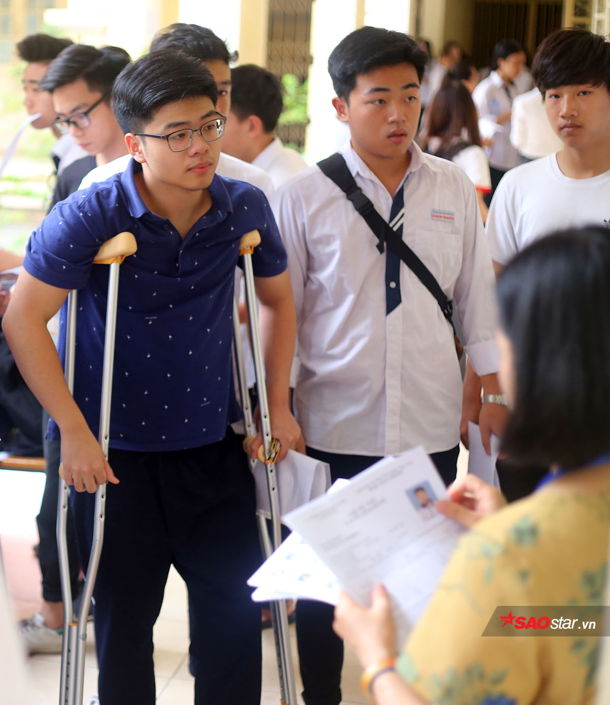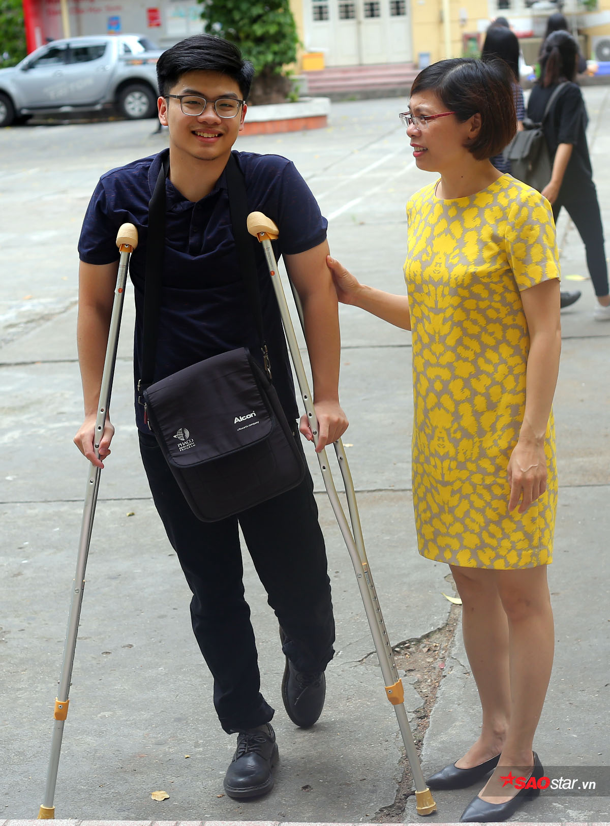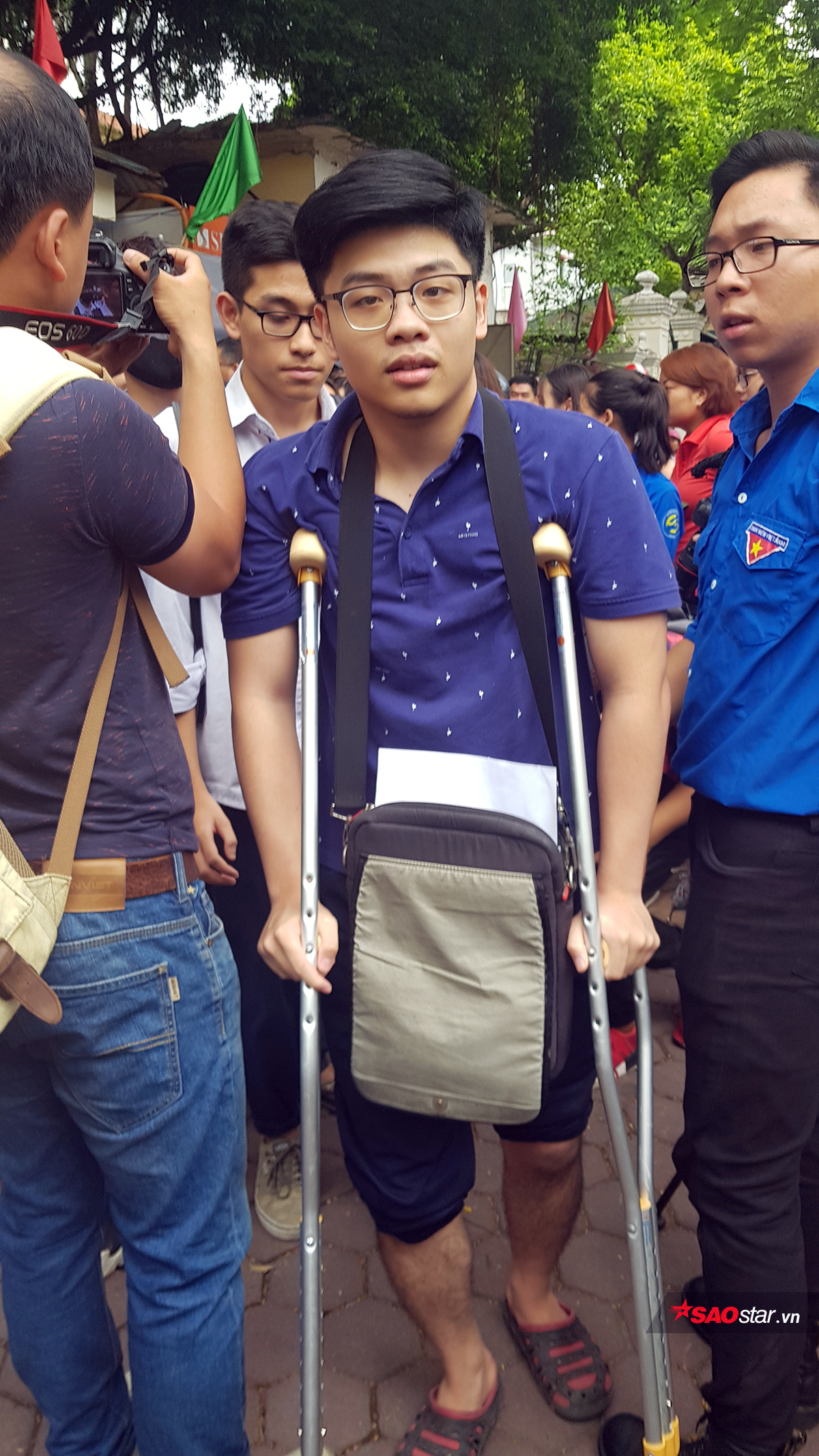 Tại điểm thi THPT Việt Đức, Phan Ngọc Long có mặt để dự thi THPT quốc gia. Nam sinh khiến những thí sinh chung quanh chú ý vì di chuyển bằng cặp nạng, nhưng nụ cười luôn nở trên môi.