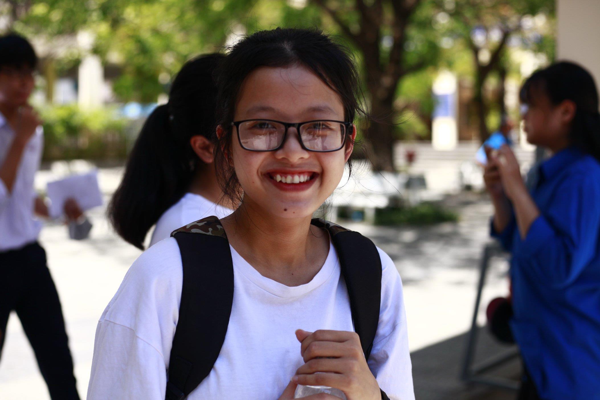 Minh Ngọc - THPT Lê Quý Đôn chia sẻ: “mình thấy đề thi năm nay khá dễ so với năm ngoái. Mình tự tin là mình sẽ được trên 7,5 điểm/môn. Mình đăng kí Khoa học tự nhiên - Đại học Quốc gia nên mong điểm số sẽ tốt để thuận lợi “