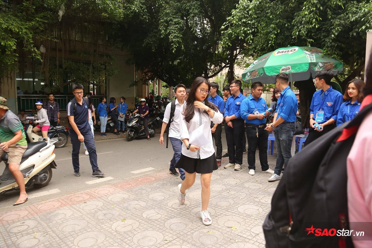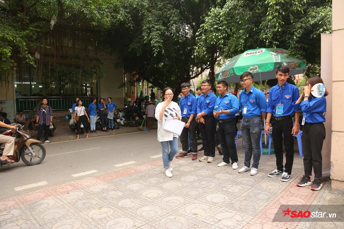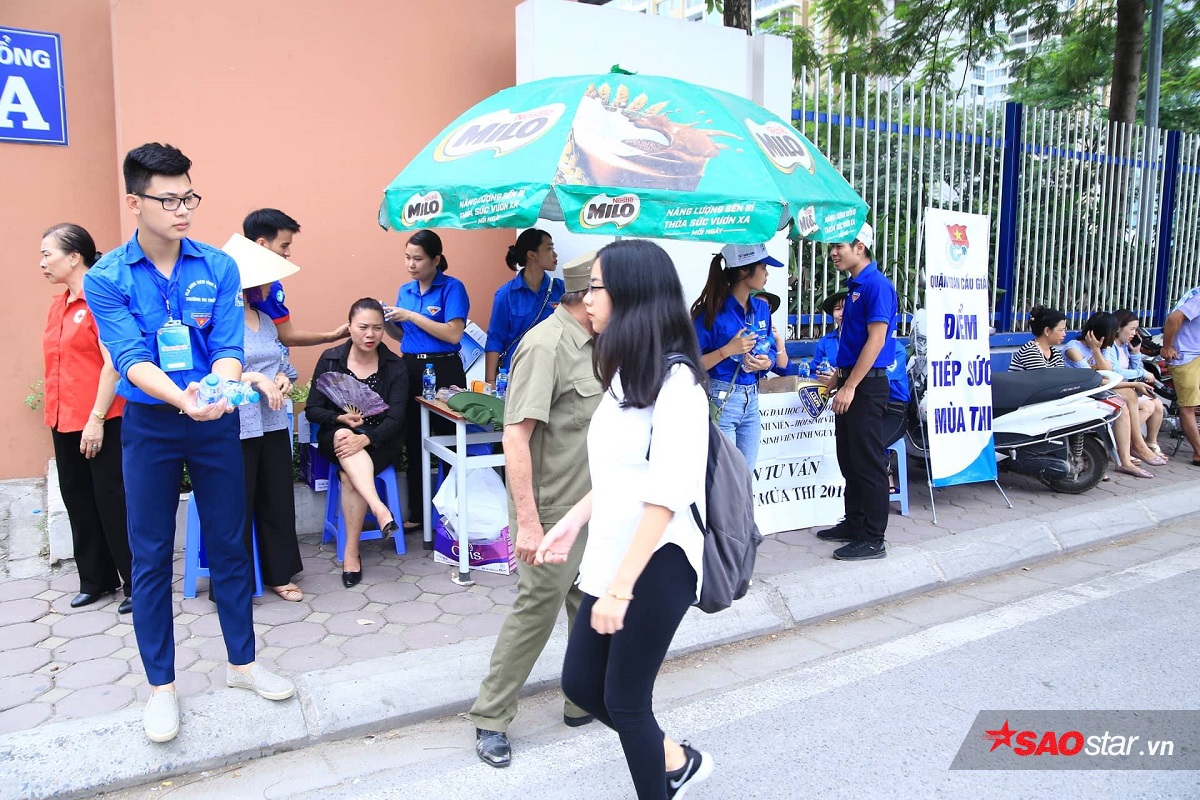 Tại các cổng trường, đội sinh viên tình nguyện tập trung hỗ trợ thí sinh và phụ huynh.
