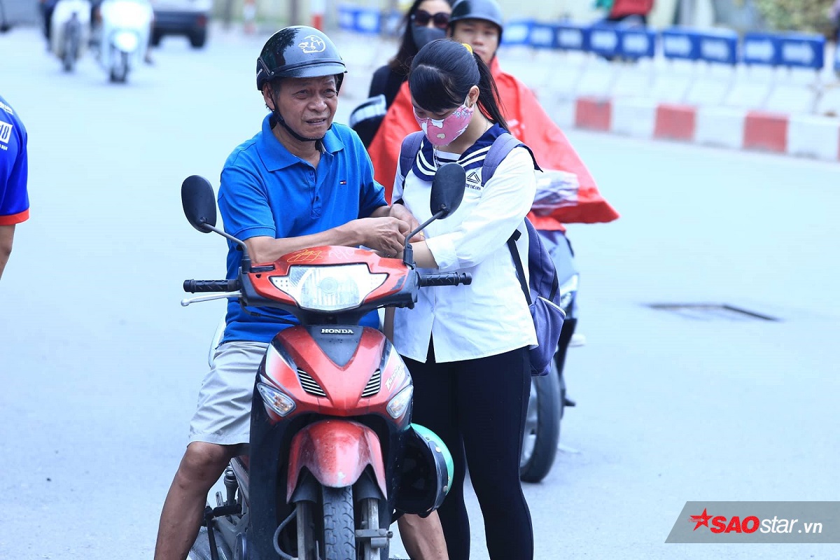 Nữ thí sinh được cha “hộ tống” đến điểm thi.