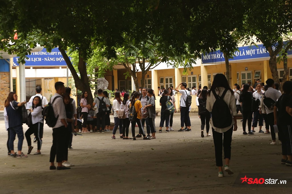 Thí sinh tập trung trong sân trường trước giờ vào phòng thi.
