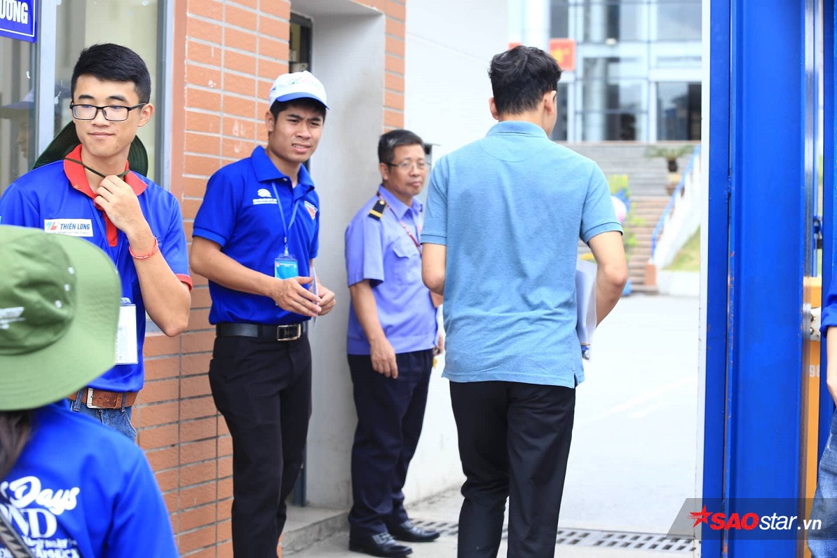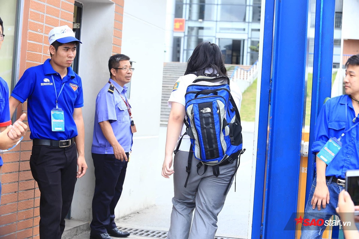 Thí sinh nam sau 14h mới có mặt, được bảo vệ và đội sinh viên tình nguyện hướng dẫn vào bên trong trường.