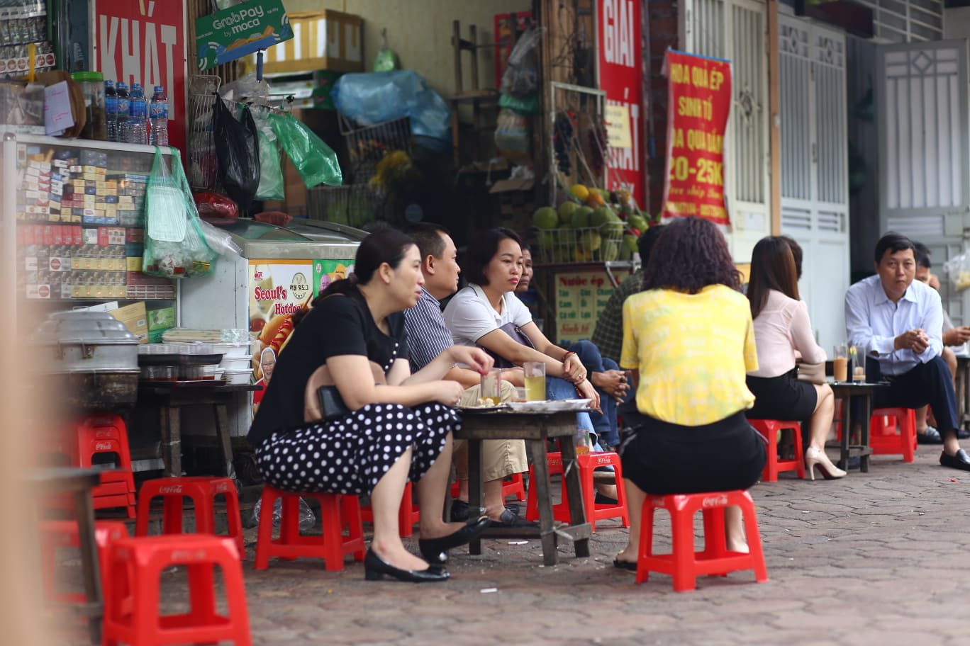 Một số phụ huynh ở điểm thi THPT Phan Đình Phùng chọn đỗ xe trên vỉa hè ngoài cổng trường, trò chuyện với các bậc cha, mẹ khác trong lúc chờ con làm bài thi.