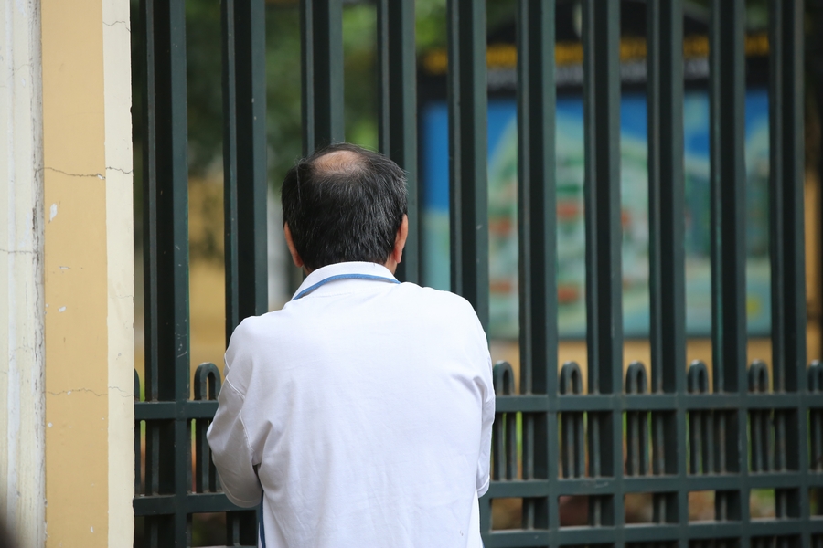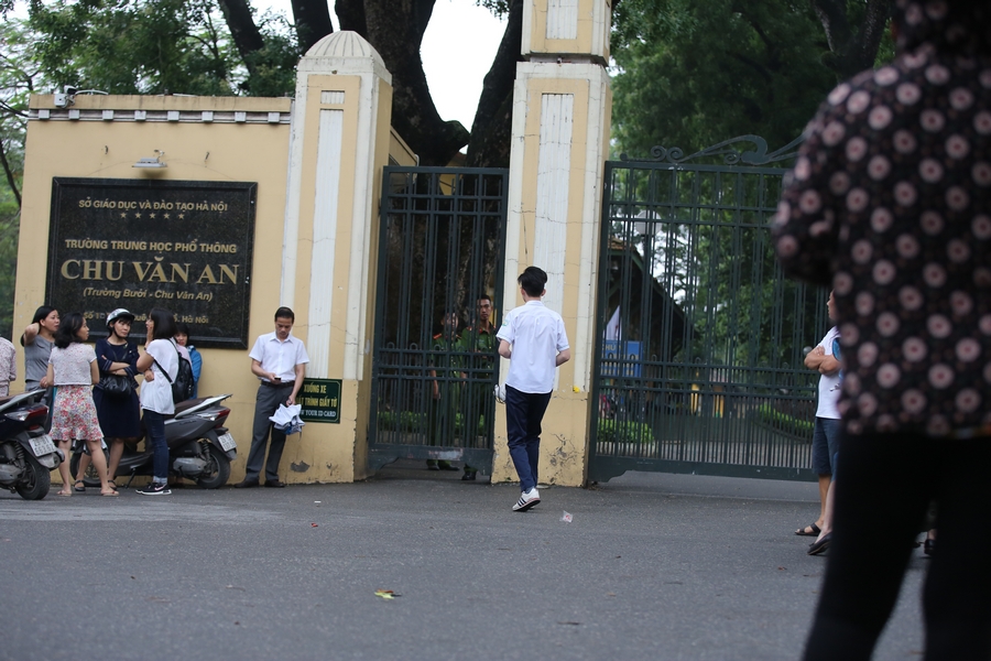 Một phụ huynh dõi ánh mắt nhìn vào bên trong trường thi THPT Chu Văn An. Lo lắng, hồi hộp khi con bước vào một kỳ thi quan trọng là tâm lý của đa số phụ huynh. Theo thống kê của Sở GD-ĐT Hà Nội, năm 2019, Hà Nội có khoảng 101.460 học sinh tốt nghiệp THCS, giảm 4.000 học sinh so với năm trước. Dựa vào số chỉ tiêu của các trường, có thể thấy có khoảng 60 - 62% số học sinh được tuyển vào THPT công lập, số còn lại sẽ phải học tại các trường ngoài công lập, trung tâm giáo dục nghề nghiệp.