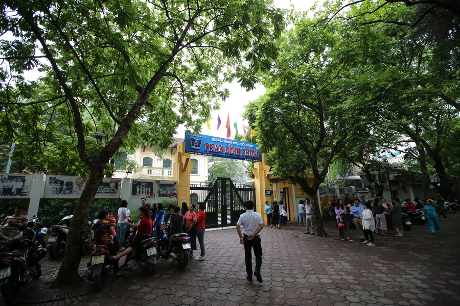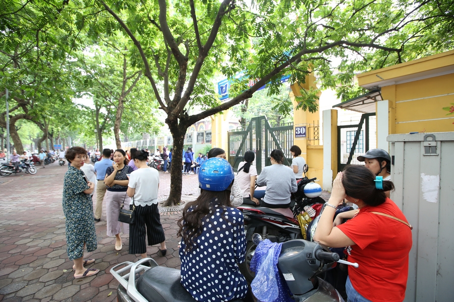 Sau khi các thí sinh vào trường thi, nhiều phụ huynh nán lại trước cổng trường THPT Việt Đức để đợi con. 2019 là năm đầu tiên thí sinh Hà Nội thi 4 môn gồm Ngữ văn, Toán, Ngoại ngữ, Lịch sử. Đây cũng là lần đầu tiên Hà Nội chỉ lấy điểm thi để xét tuyển vào lớp 10 công lập, không tính điểm rèn luyện và học tập của học sinh ở bậc THCS.