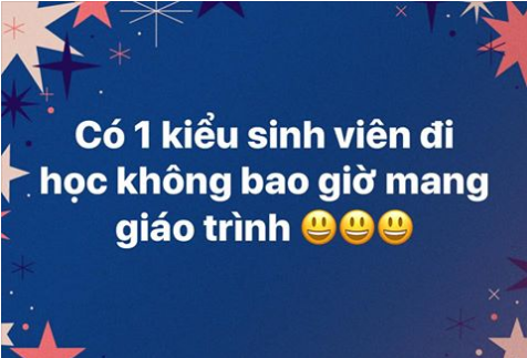 Cô bạn Trang Ete thì có cách đối phó với thầy cô “bá đạo” hơn mỗi lần đến trường: “Mình thì chả cần giáo trình làm gì, tốn tiền. Bút thì đi mượn, cướp đc 1 quyển vở thì “bách khoa toàn thư” luôn, viết tất cả các môn vô, ôn thi đơn giản và dễ dàng. Mỗi lần đi học lại chẳng mất nhiều thời gian chuẩn bị”.
