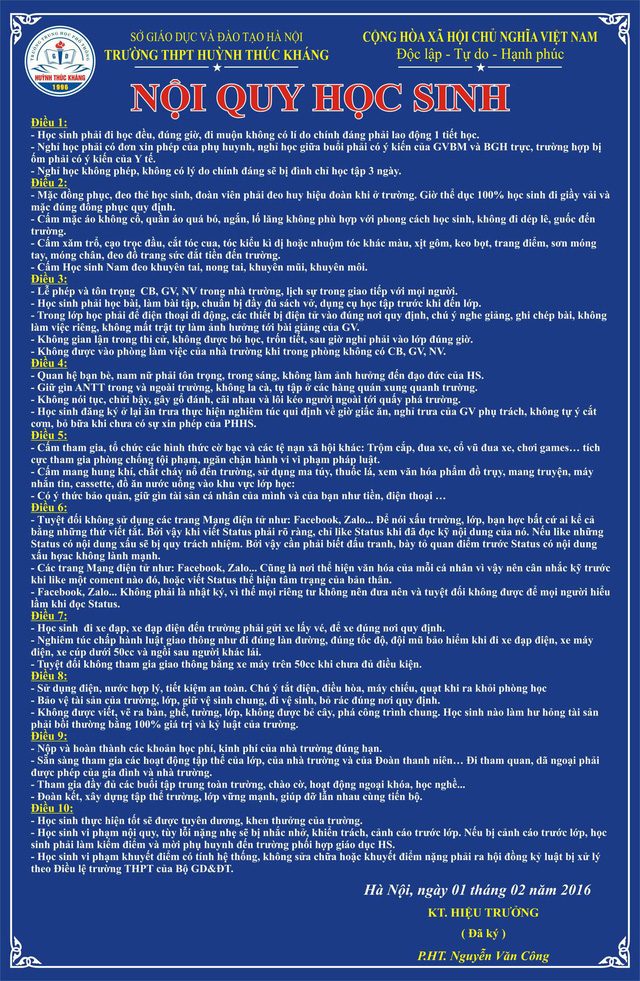 Ngoài thông điệp nhằm mong muốn những điều đạt được, nhà trường còn có cả bảng nội quy với 10 điều rất nghiêm túc.