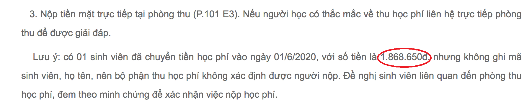 “Có 1 sinh viên chuyển tiền học phí vào ngày 1/6, với số tiền là 1.868.650.000 đồng, nhưng không ghi mã sinh viên, họ tên, nên bộ phận thu học phí không xác định được người nộp. Đề nghị sinh viên liên quan đến phòng thu học phí, đem theo minh chứng để xác nhận việc nộp học phí”, lưu ý đặc biệt trong thông báo.